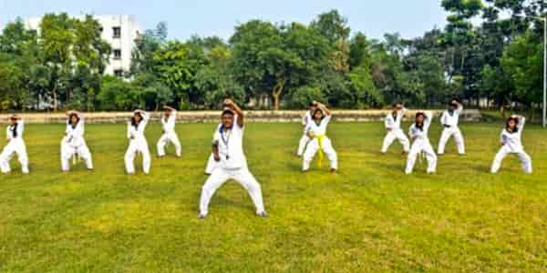 The school building is very big and has a large playground (about 150 meters long) for children to play and do sports. There are separate courts for basketball, lawn tennis, cricket nets, badminton, skating, and a special play area for small kids.